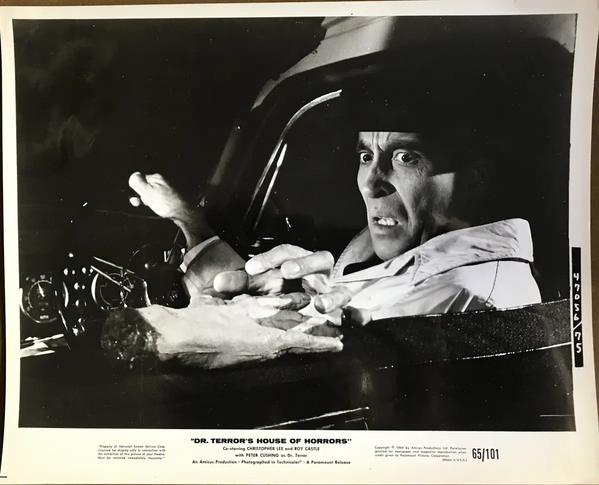 Great shot of Christopher Lee in the car with the amputated hand. Light wear to the corners.